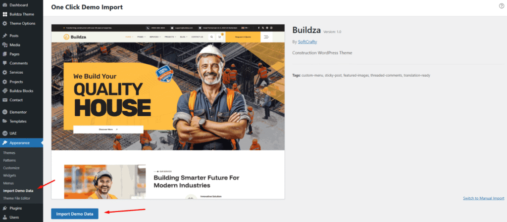 Buildza includes a One-Click Demo Import feature that allows you to quickly replicate the demo website on your installation. This is the fastest way to get started and explore how the theme works.