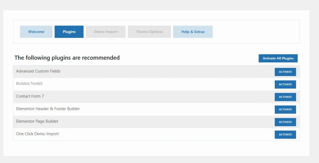 Appearance → Themes and activate the Buildza theme.